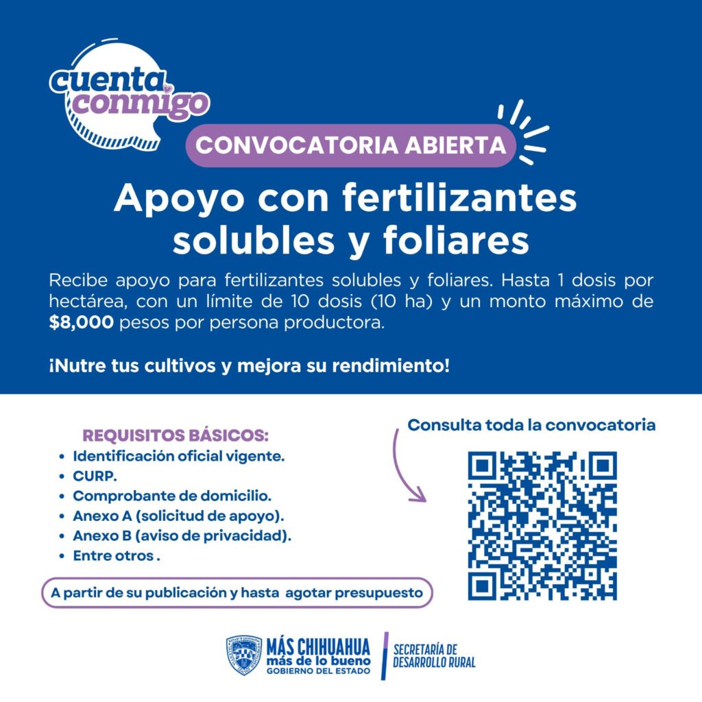 La Secretaría de Desarrollo Rural (SDR) informó que ya se encuentra disponible la convocatoria para que las y los productores agrícolas accedan al apoyo para adquisición de fertilizantes solubles y foliares, como parte del programa Cuenta Conmigo en el Campo.