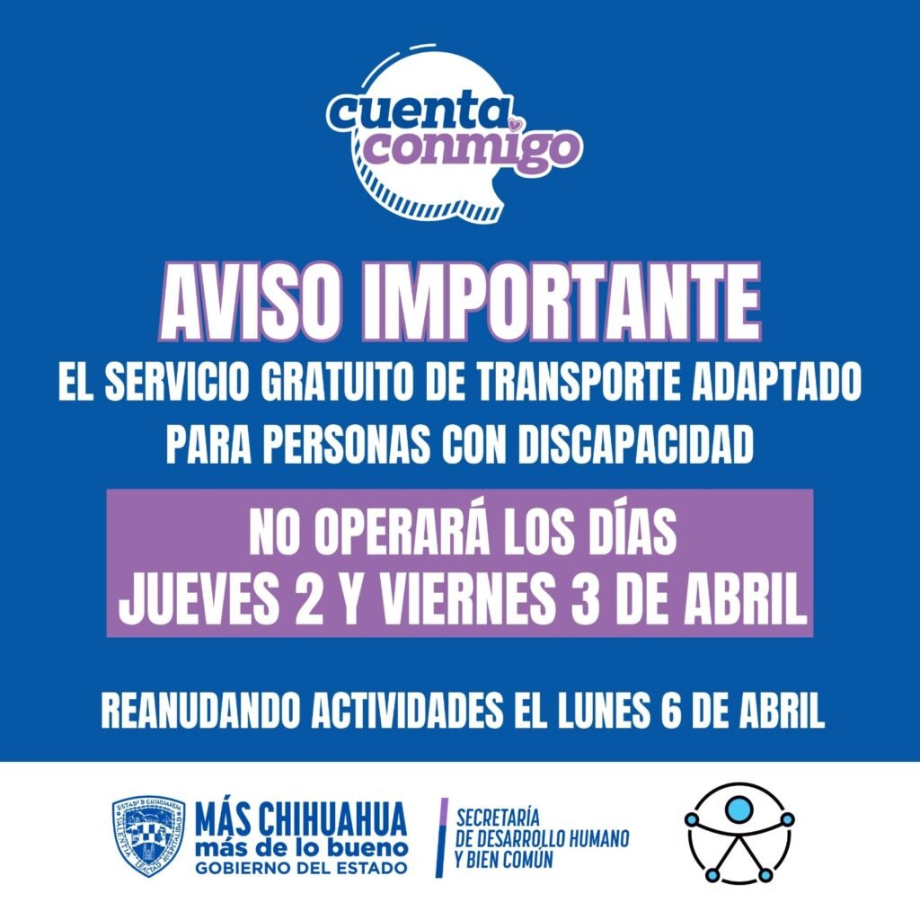 La Secretaría de Desarrollo Humano y Bien Común (SDHyBC) informa a la ciudadanía que, con motivo del periodo de Semana Santa, el servicio gratuito de transporte adaptado para personas con discapacidad será suspendido temporalmente en la capital.