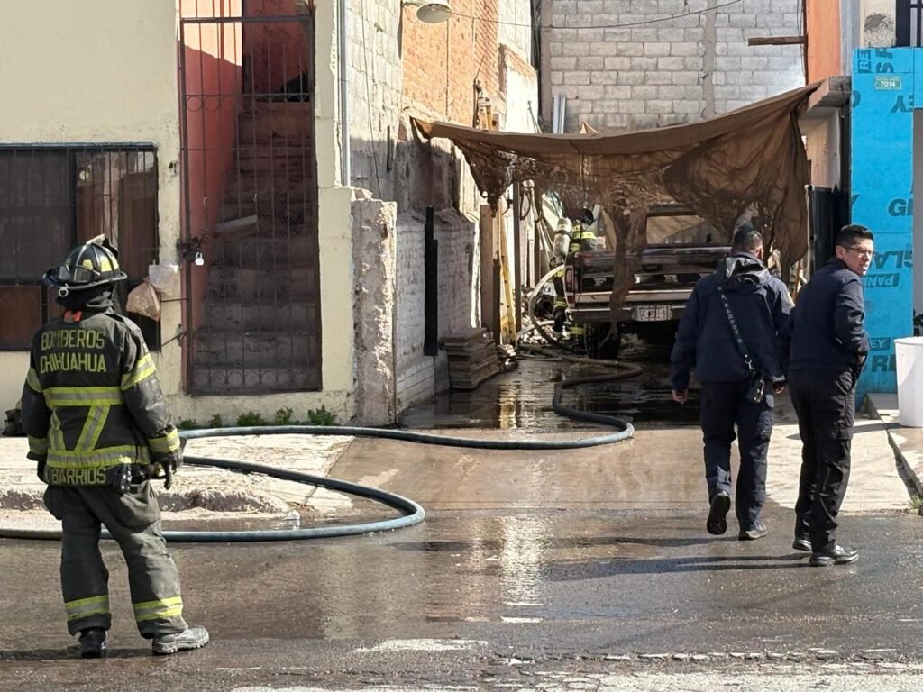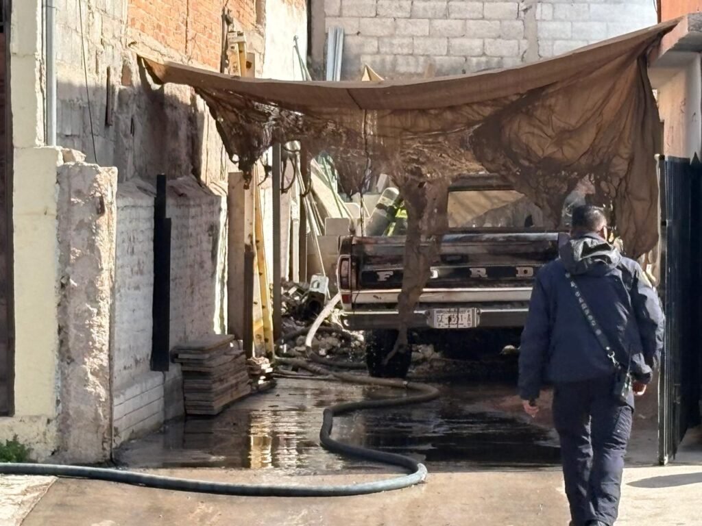 Una pick up Ford de modelo atrazado que cuanta con equipo a gas, tiene una fuga; se encontraba en la cochera y traspatio del domicilio y mientras se encontraban realizando trabajos de soldadura en el lugar, la chispas de soldadura alcanzan la fuga de gas y el vehículo empezó a incendiarse.