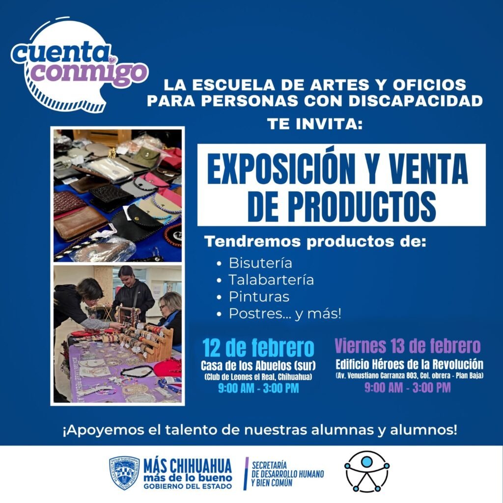 El secretario de Desarrollo Humano y Bien Común, Rafael Loera, anunció el inicio de las primeras exposiciones y ventas del año de productos elaborados por personas usuarias de la Escuela de Artes y Oficios, como parte de las estrategias impulsadas por la gobernadora Maru Campos para fortalecer el autoempleo y la inclusión laboral de personas con discapacidad.
