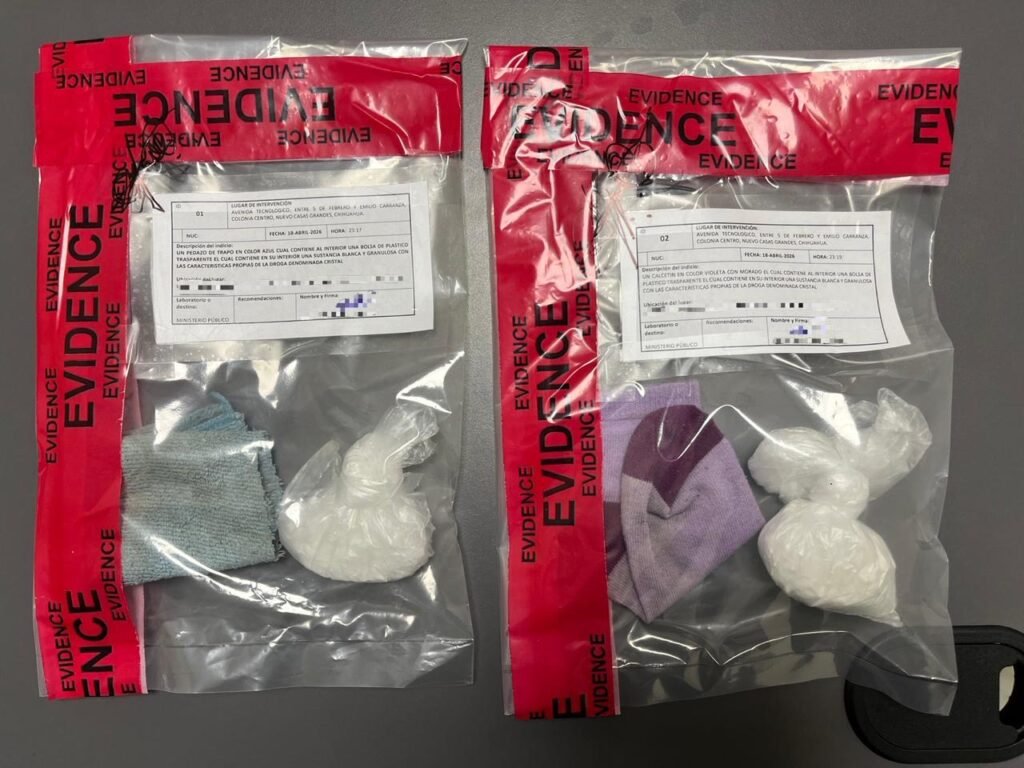 El arresto se registró la noche del sábado 18 de abril, en el cruce de la avenida Tecnológico y calle 5 de febrero de la colonia Centro, tras encontrarle a cada uno, un envoltorio de plástico que contienen una sustancia cristalina y granulosa con características propias del cristal.