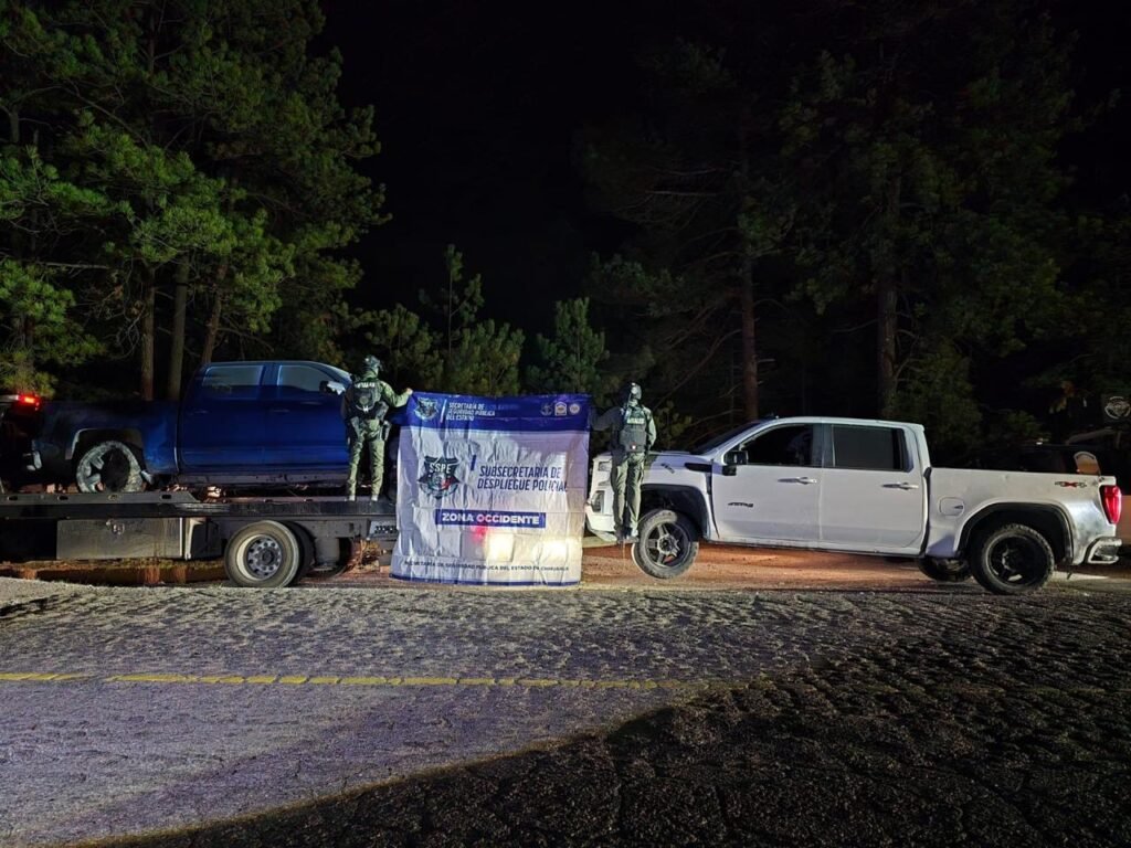 Durante la intervención, se aseguraron tres vehículos, dos de ellos con reporte de robo en Estados Unidos, en los estados de California y Colorado, respectivamente, mientras que un tercero presentaba impactos por proyectil de arma de fuego. Uno de los vehículos contaba además con blindaje artesanal en la carrocería.