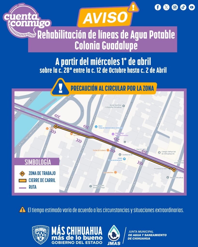 La Junta Municipal de Agua y Saneamiento (JMAS) de Chihuahua iniciará este miércoles 1 de abril los trabajos de rehabilitación de la red de agua potable en la colonia Guadalupe, para mejorar el servicio que se brinda a la ciudadanía. Las labores se realizarán sobre la calle 28ª, entre 12 de Octubre y 2 de […]