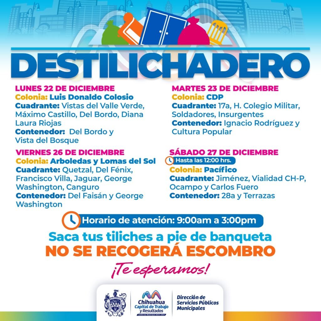 Para evitar acumulaciones de basura de grandes dimensiones en las viviendas, que podría generar plagas o problemas de salud, el Gobierno Municipal, a través de la Dirección de Servicios Públicos Municipales, informa el calendario del programa Destilichadero, que se realizará en siete colonias de la capital del 15 al 20 de diciembre. El Destilichadero consiste […]
