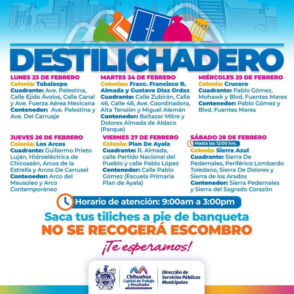 Para evitar acumulaciones de basura de grandes dimensiones en las viviendas, que podría generar plagas o problemas de salud, el Gobierno Municipal, a través de la Dirección de Servicios Públicos Municipales, informa el calendario del programa Destilichadero, que se realizará en siete colonias de la capital del 23 al 28 de febrero. El Destilichadero consiste […]