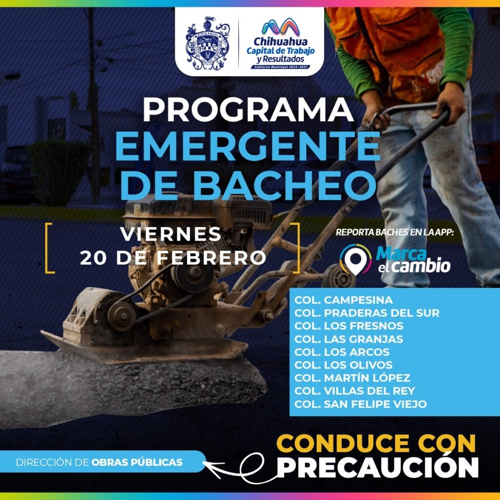 El Gobierno Municipal, a través de la Dirección de Obras Públicas, realizará trabajos de bacheo este viernes 20 de febrero mediante el programa emergente en calles de las colonias: Campesina, Praderas del Sur, Los Fresnos, Las Granjas, Los Arcos, Los Olivos, Martín López, Villas del Rey y San Felipe Viejo. Para seguridad de conductores, se […]