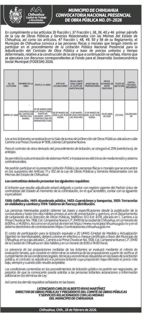 El Gobierno Municipal de Chihuahua publicó este sábado la convocatoria dirigida a personas físicas y morales interesadas en participar en la Licitación Pública Nacional Presencial para la adjudicación del contrato de obra pública que permitirá la construcción del nuevo Centro de Bienestar Animal. Con esta acción, el alcalde Marco Bonilla avanza en el cumplimiento de […]