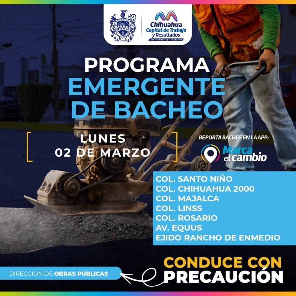 El Gobierno Municipal, a través de la Dirección de Obras Públicas, realizará trabajos de bacheo este lunes 02 de marzo mediante el programa emergente en las calles de las colonias: Santo Niño, Chihuahua 2000, Majalca, Linss y Rosario, así como en la avenida Equus y el Ejido Rancho de Enmedio. Para seguridad de conductores, se […]