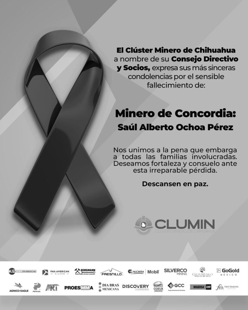 El Cluster Minero de Chihuahua (CLUMIN) lamenta profundamente el fallecimiento del ingeniero Saúl Alberto Ochoa Pérez, minero localizado sin vida en La Concordia, Sinaloa. “Nos unimos al dolor que embarga a su familia, así como a todas las familias involucradas, deseándoles consuelo y fortaleza en esta irremediable pérdida”, comentó. La localización del cuerpo del minero […]