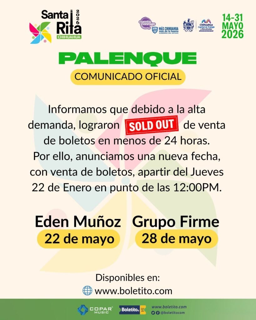Debido al gran numero de ventas en menos de 24 horas, el patronato de la Feria de Santa Rita 2026 anuncia una fecha más para Eden Muñoz y Grupo Firme en el palenque. “Informamos que debido a la alta demanda, lograron SOLD OUT de venta de boletos en menos de 24 horas. Por ello, anunciamos […]