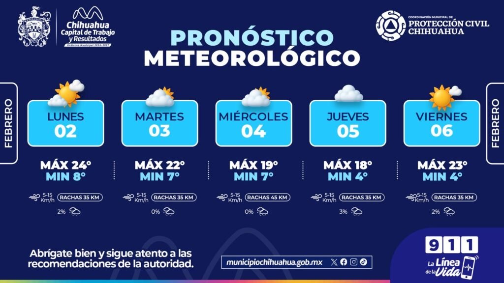 H. Ciudad de Chihuahua, Chih., a 2 de febrero de 2026.- La Coordinación Municipal de Protección Civil informa que, durante la semana del lunes 2 al viernes 6 de febrero, se prevé un comportamiento climático con descenso gradual de temperaturas, mayor presencia de nubosidad a mitad de semana y condiciones mayormente estables en la capital […]