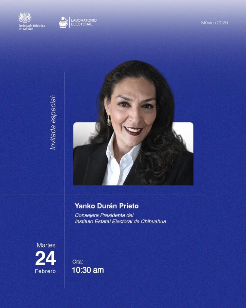 Por invitación de la *Embajada Británica en México* y el *Laboratorio Electoral*, la Consejera Presidenta del Instituto Estatal Electoral de Chihuahu, Yanko Durán Prieto, asiste a la presentación del “*Protocolo de atención de la violencia electoral*”. 📅 Martes 24 de febrero — 10:30 horas 📍 Lugar: Embajada Británica en México Este protocolo busca fortalecer las […]
