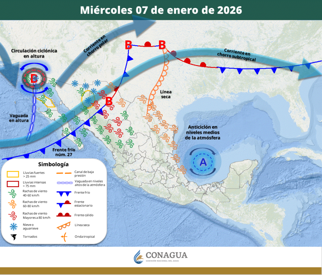 Para este miércoles, el frente frío número 27 sobre el extremo noroeste y frontera norte de México, en interacción con las corrientes en chorro subtropical y polar, una vaguada en altura, un canal de baja presión, una línea seca sobre Coahuila y la entrada de humedad procedente del Océano Pacífico, favorecerán ambiente de frío a […]