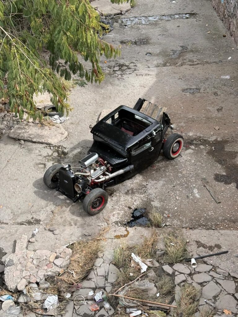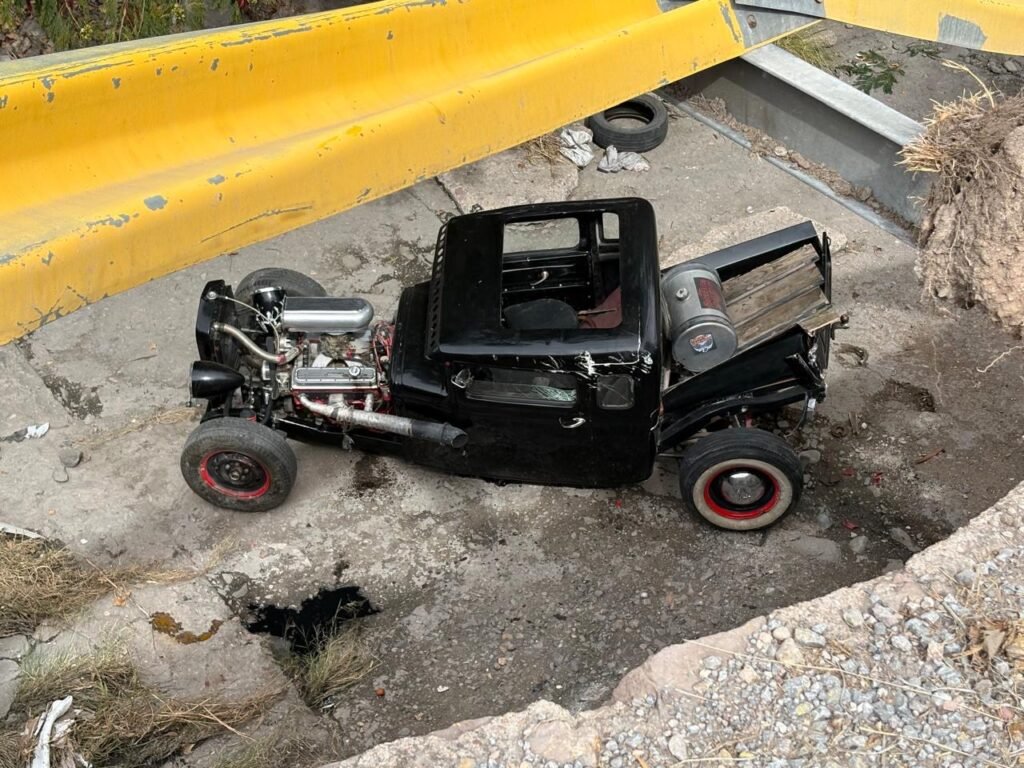 En plano canal que divide las colonias La Junta con Industral, cayó un vehículo clásico.