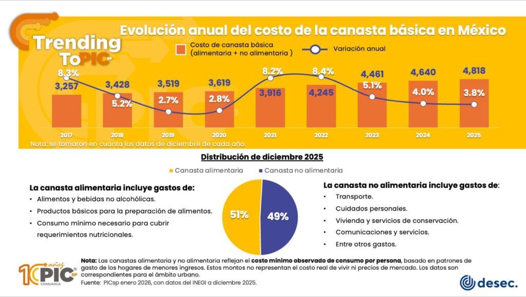 En los últimos 8 años, el costo de la canasta básica aumentó casi 48%, elevándose de $3,257 mensuales en 2017 a $4,818 en 2025.