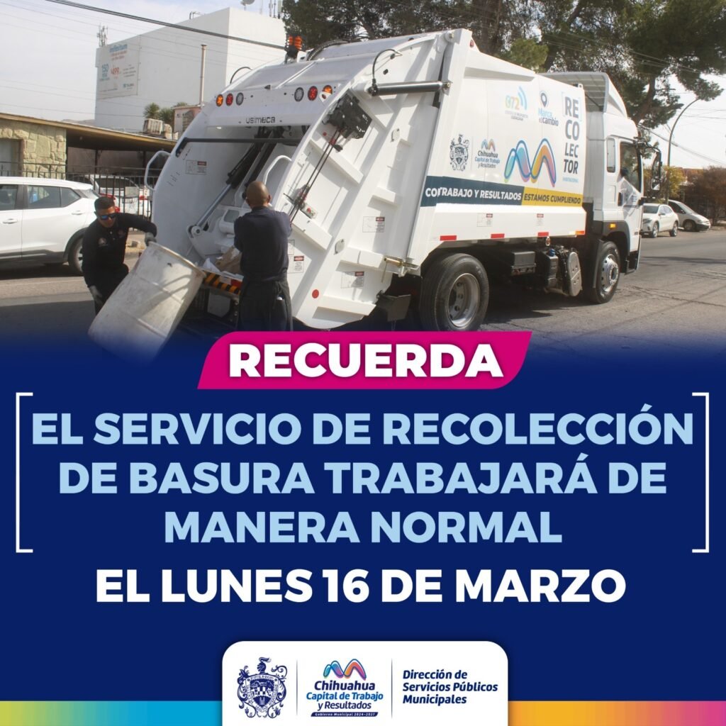 _*H. Ciudad de Chihuahua, Chih., a 16 de marzo de 2026.-*_ El Gobierno Municipal, a través de la Dirección de Servicios Públicos Municipales, recuerda a la ciudadanía en general que el servicio de recolección de basura habitacional trabajará de forma ordinaria este lunes 16 de marzo. Si bien el tercer lunes marzo, está previsto como […]