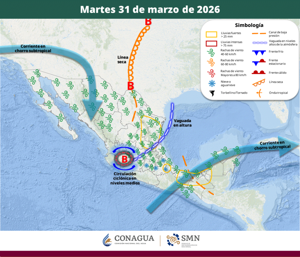 Este martes, una circulación ciclónica en niveles medios y una vaguada en altura se desplazarán sobre el occidente, centro y noreste de la República Mexicana, en interacción con línea seca y canales de baja presión en el interior del país, la corriente en chorro subtropical e inestabilidad atmosférica, ocasionarán fuertes rachas de viento y la […]