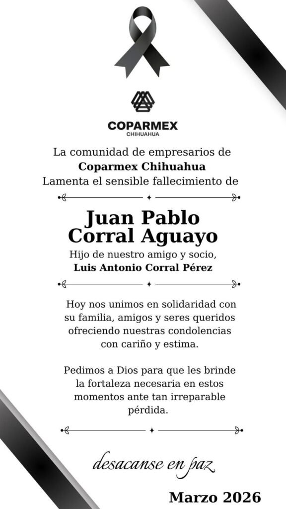 A través de redes sociales se dio a conocer el fallecimiento de Juan Pablo Corral Aguayo, hijo del empresario chihuahuense Luis Antonio Corral. Al parecer falleció en un accidente mientras viajaba en Marruecos acompañado por unos amigos. Organismos empresariales han dado a sus condolencias en redes sociales. Luis Antonio Vorral es miembro importante del sector […]