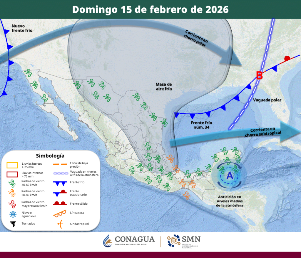 El frente frío núm. 34 y una vaguada polar se desplazarán sobre el norte y noreste de México, en interacción con las corrientes en chorro polar y subtropical, ocasionarán lluvias e intervalos de chubascos y vientos con rachas fuertes a muy fuertes en las regiones mencionadas, con probabilidad para la formación de torbellinos en zonas de Coahuila y Nuevo León; además de […]