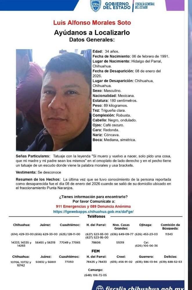 El comisario de la Dirección de Seguridad Pública Municipal, Julio César Salas, confirmó que un elemento activo de la Policía Municipal de Chihuahua fue detenido en Estados Unidos, luego de que durante varios días se mantuviera vigente un reporte de desaparición. Se trata de Luis Alfonso Morales Soto, de 34 años de edad, quien desempeñaba […]