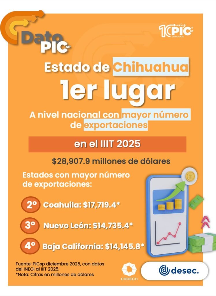En este sentido se informó que Chihuahua se sigue consolidando en el primer lugar en exportaciones en todo el país, el último trimestre reporta 28 mil 908 millones de dólares.