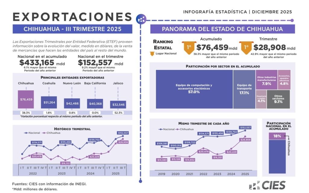 Chihuahua presenta un crecimiento respecto al mismo periodo en 2024, esto representa 38.3% en el acumulado y 42.9% en el trimestre, el estado aporta el 18% a nivel nacional.