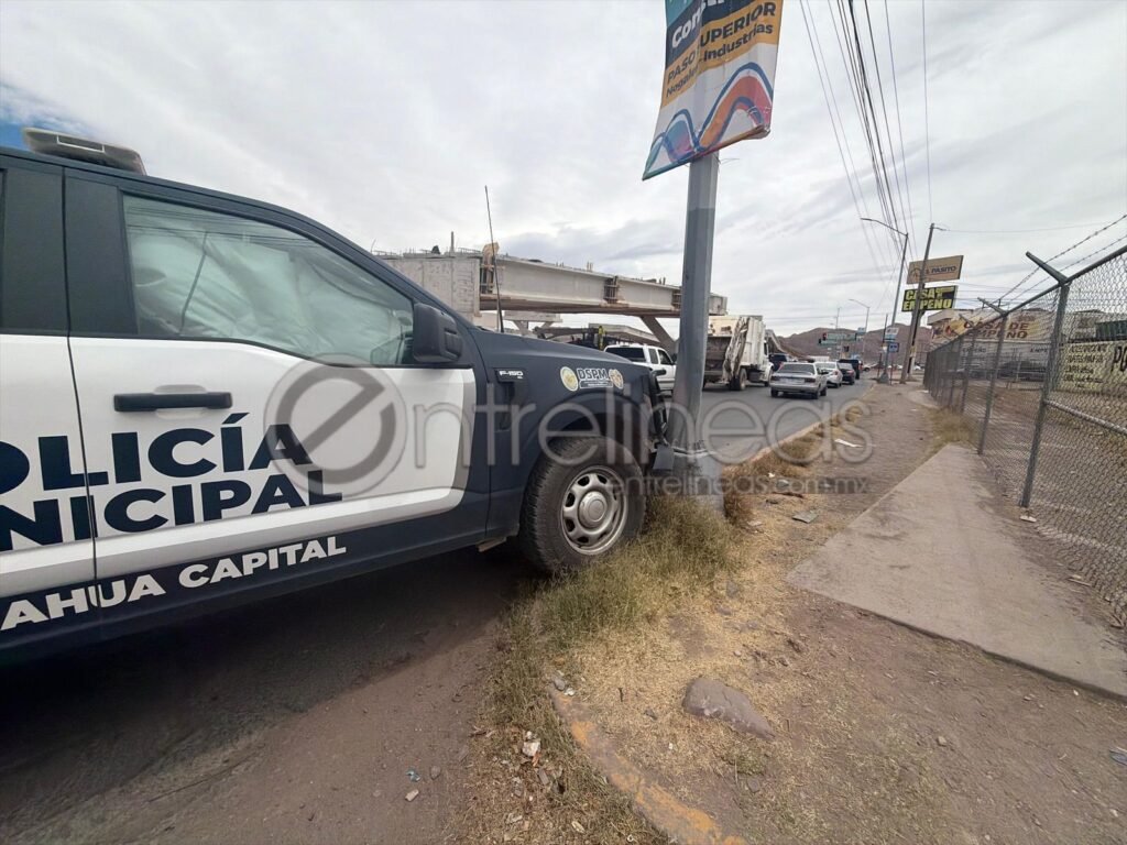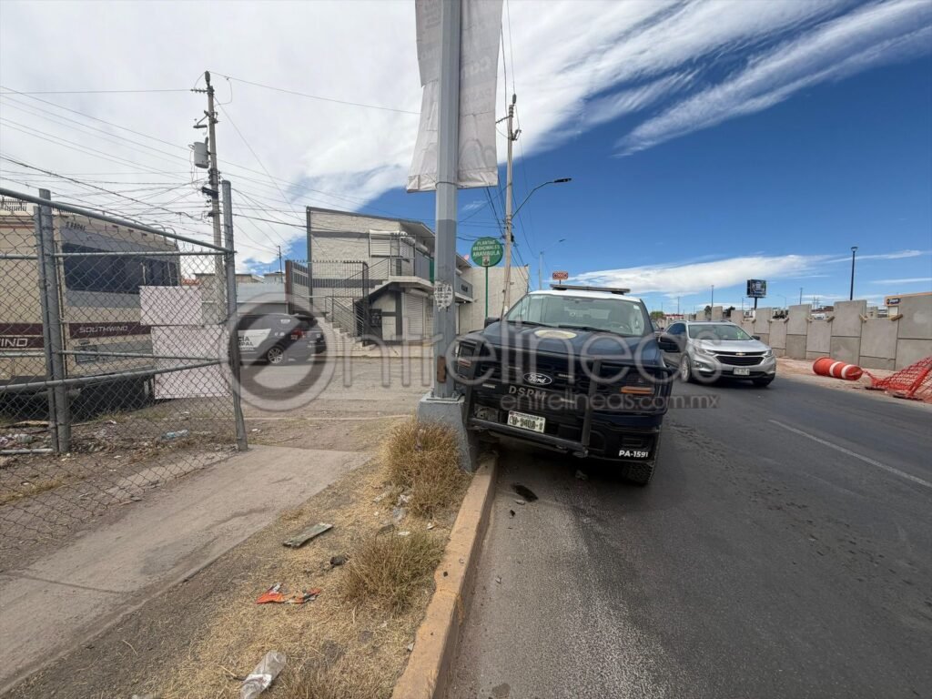 Una patrulla municipal fue protagonista de un choque en la colonia Chihuahua 2000 en donde la unidad con el número económico PA-1591, habría colisionado en contra de un poste de alumbrado público en la colonia Chihuahua 2000.