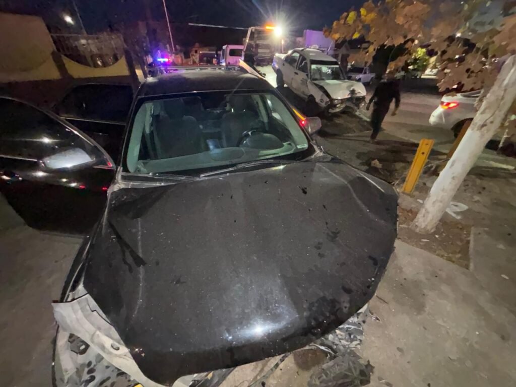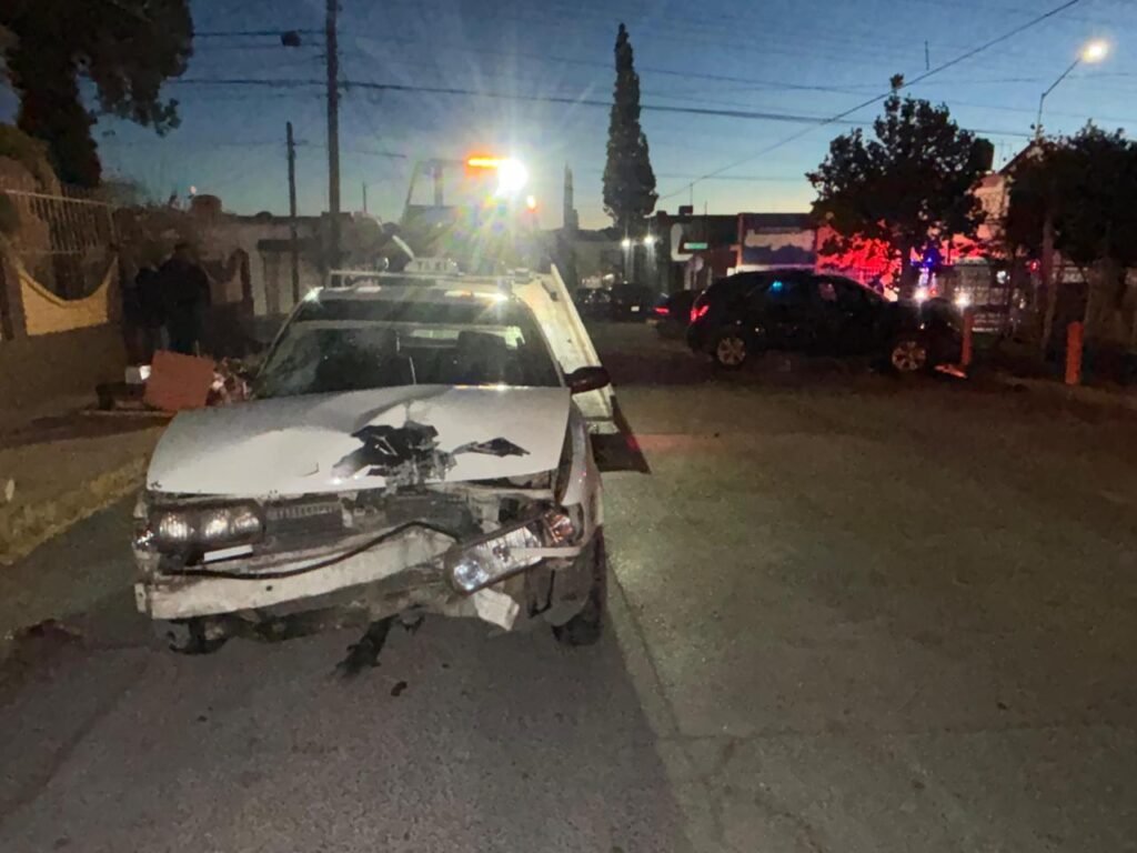 El taxi del Sitio Saucito número 548, por el golpe proyectó a la camioneta contra la banqueta y ambos terminaron incrustados en los retenedores