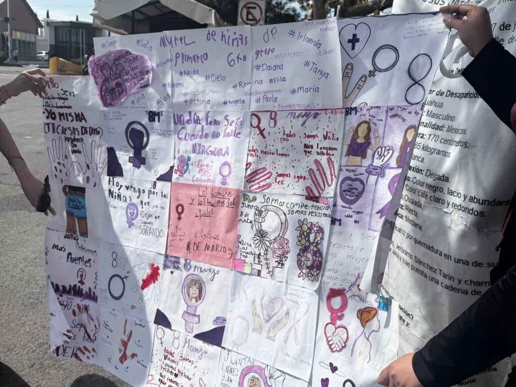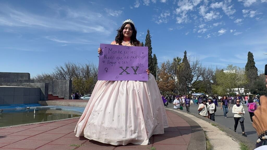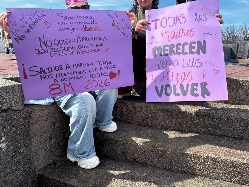 En su mayoría se aprecian atuendos morados y verdes, muchas de las participantes portan letreros con denuncias de violencia y consignas para exigir respeto a sus derechos.