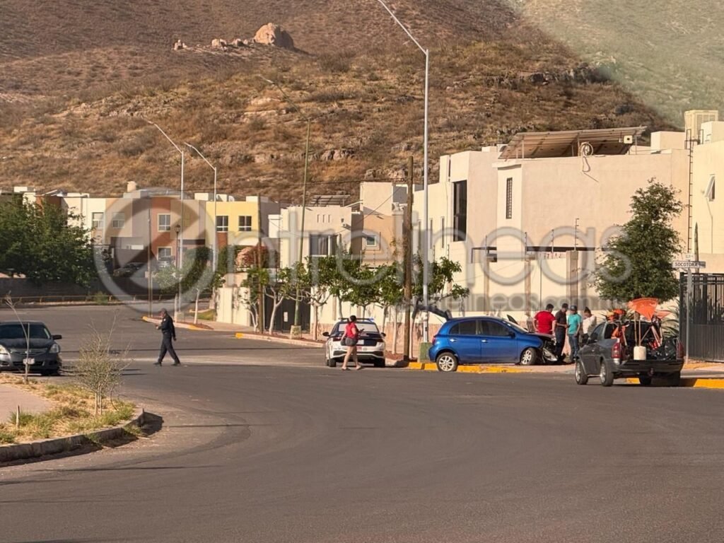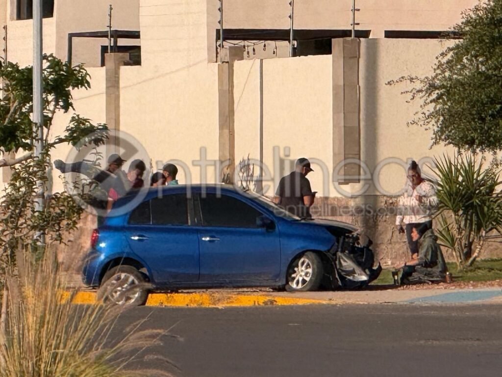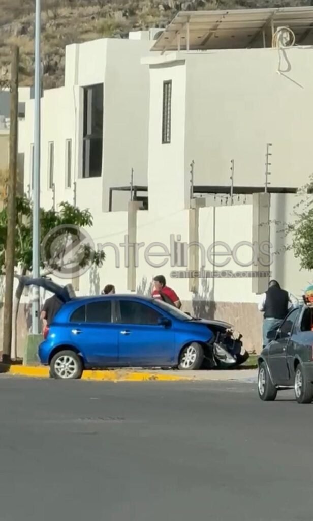 En el cruce de las calles Río Guijón y Socotora, al exterior del fraccionamiento Ancona, la conductora de un vehículo Nissan March de color azul, se impactó contra la banqueta y quedó arriba de la misma.