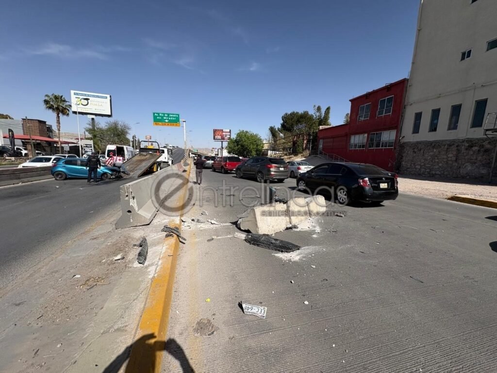 Una mujer a bordo de un Mazda 2 de color azul circulaba a exceso de velocidad choca contra dos durmientes de concreto, uno de ellos queda bloqueando un carril lateral.