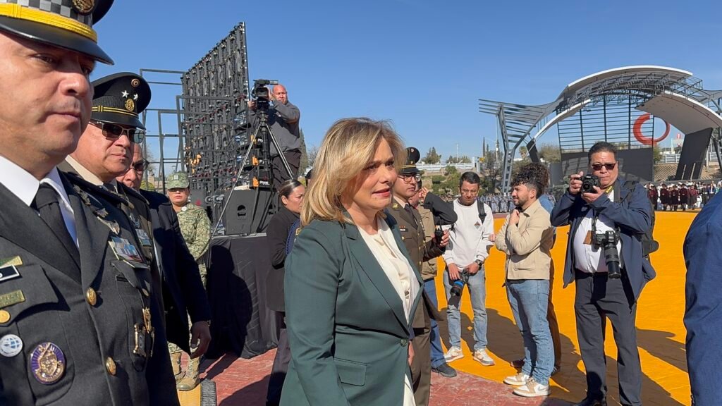 El acto protocolario estuvo encabezado por la gobernadora María Eugenia Campos Galván, quien recibió el lábaro patrio por parte de las fuerzas armadas y tomó protesta a bandas de guerra y escoltas de diversos planteles educativos.