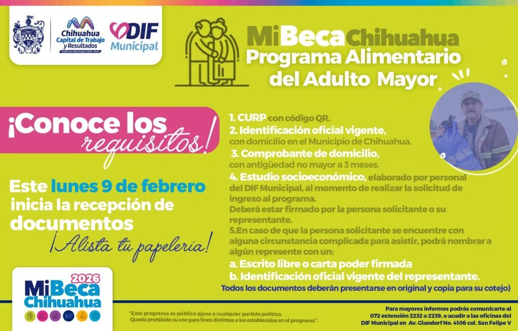 El Gobierno Municipal, a través del DIF Municipal, dio a conocer los requisitos para ser beneficiario del Programa Alimentario y de Desarrollo Humano del Adulto Mayor (PAAM) 2026, dirigido a personas mayores de 60 años que habitan en el municipio de Chihuahua.