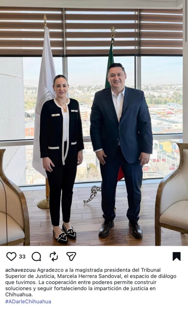 “Agradezco a la magistrada presidenta del Tribunal Superior de Justicia, Marcela Herrera Sandoval, el espacio de diálogo que tuvimos. La cooperación entre poderes permite construir soluciones y seguir fortaleciendo la impartición de justicia en Chihuahua”, publicó Chávez Madrid en sus redes sociales.