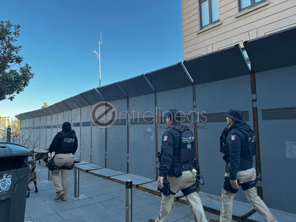 Asimismo, al exterior de la muralla de acero se encuentran elementos de seguridad, acompañados de la Unidad Canina K9, caminando sobre el perímetro.