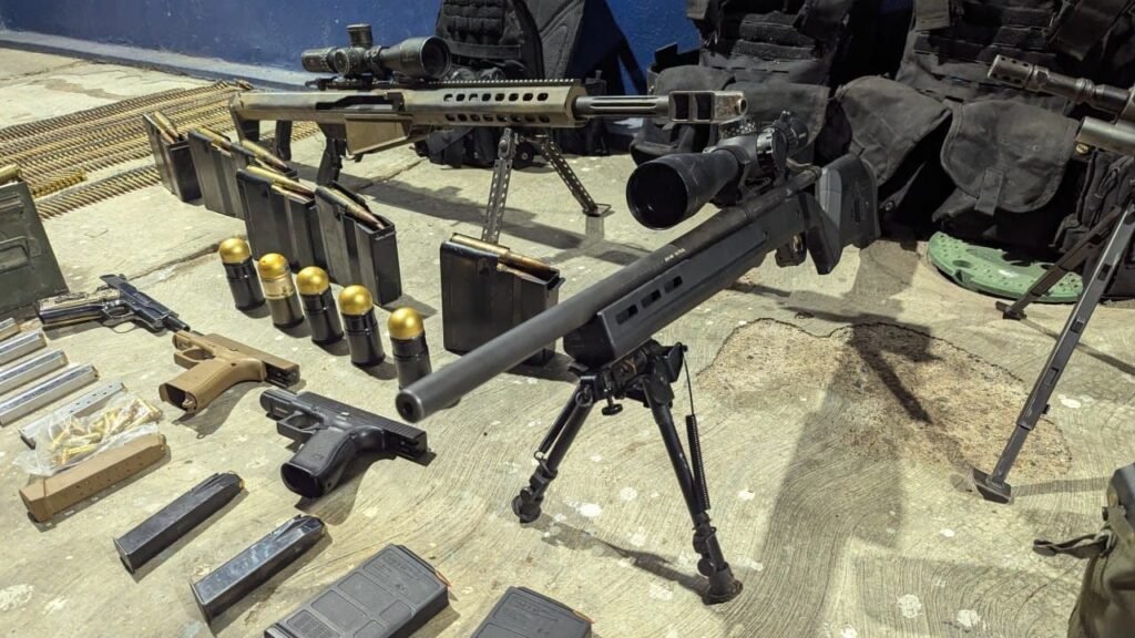 Asimismo, los sujetos portaban cuatro granadas, un dron con seis baterías, cuatro piezas de equipo táctico con placas balísticas, radios de comunicación, 186 dosis de presunta cocaína y un total de un millón 100 mil pesos en efectivo.