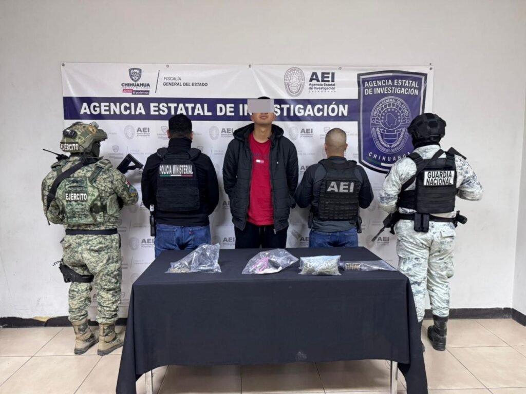 Elementos de la Agencia Estatal de Investigación adscritos al Centro de Operaciones Estratégicas de la Fiscalía de Distrito Zona Norte, detuvieron al masculino identificado como Johan Isac M. F., por delitos contra la salud y posesión ilegal de armas de fuego, en Ciudad Juárez.
