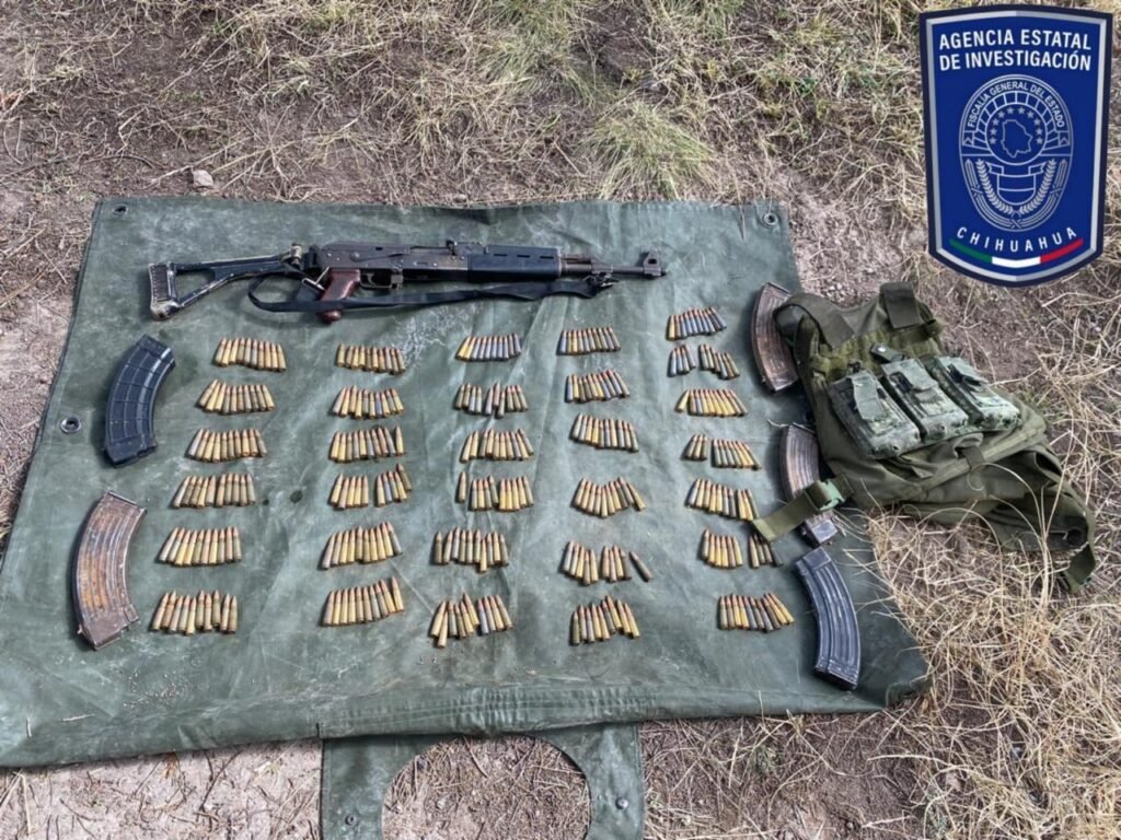 Al darle alcance, los efectivos se percataron que llevaba consigo un fusil marca Century Arms, calibre 7.62 x 39, cinco cargadores, 588 cartuchos del mismo calibre y un chaleco táctico de color verde, los cuales le fueron asegurados.