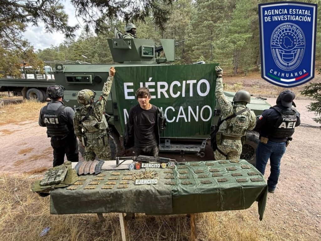 Una Célula de la Bases de Operación Interinstitucional (BOI) desplegada en el municipio de Guadalupe y Calvo, detuvo en flagrancia a un masculino identificado como Luis Martín V.N., de 23 años de edad, por el delito de portación ilegal de arma de fuego.