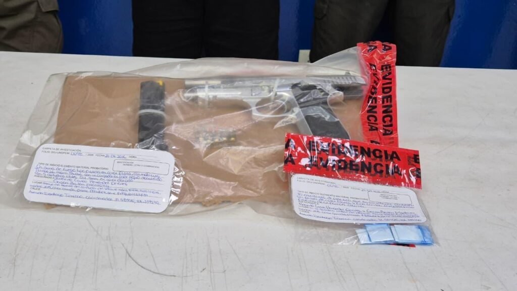 Durante la inspección del vehículo, se localizaron 10 envoltorios con una sustancia con características similares a la cocaína, así como un arma de fuego tipo pistola calibre 9 milímetros abastecida, por lo que se procedió a su detención conforme a los protocolos legales.