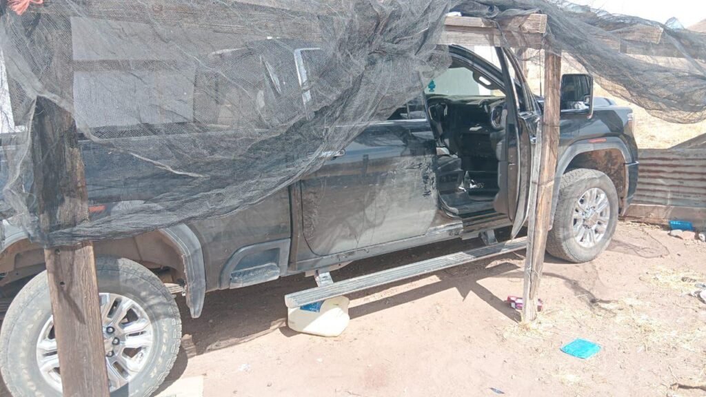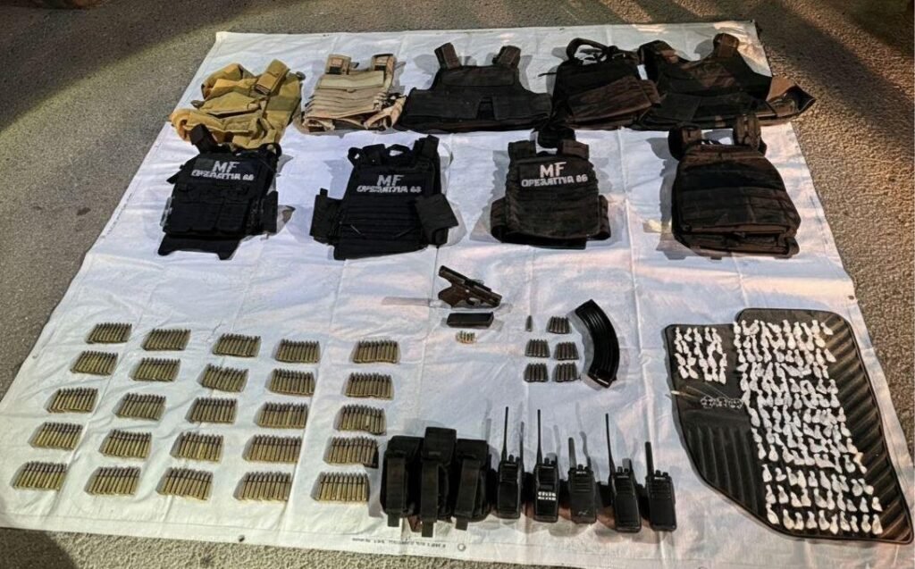De manera paralela, los elementos localizaron un vehículo GMC Denali en aparente estado de abandono. Al realizar la inspección correspondiente, se encontraron en su interior nueve chalecos tácticos, cinco radios de comunicación, un cargador metálico y 276 cartuchos útiles.