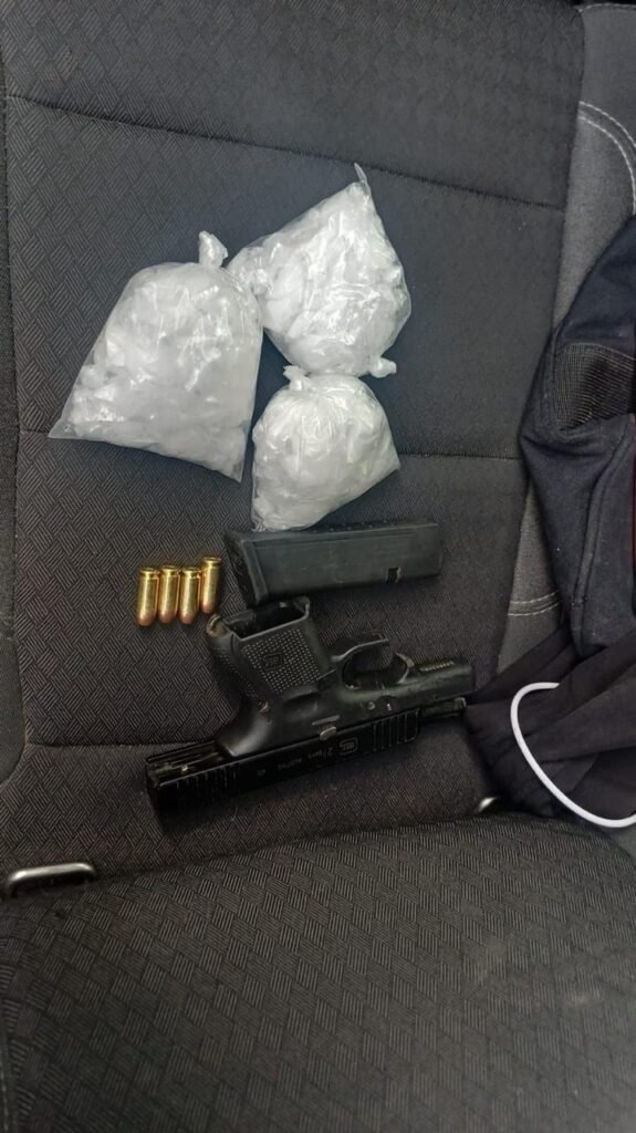Durante la revisión se le aseguró un envoltorio plástico que contenía en su interior 150 dosis individuales de una sustancia con características similares al cristal. Asimismo, el sujeto portaba una pistola abastecida con cuatro cartuchos útiles.