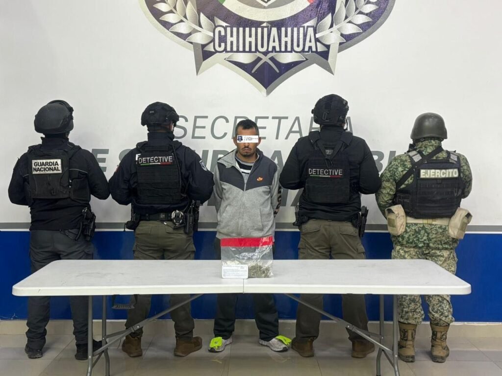Fue en el cruce de las calles Ejido Meoqui y Benjamín Argumedo donde los elementos lograron darle alcance al vehículo. Durante la inspección, se localizaron en la guantera seis envoltorios que contenían una hierba verde, seca y olorosa, con características similares a la marihuana.