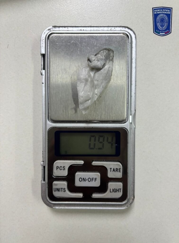 Procedieron a realizarle una revisión, encontrando entre sus pertenencias un envoltorio transparente que contenía droga conocida como cristal con un peso de .94 gramos, así como un envoltorio con mariguana con un peso de 8.90 gramos.