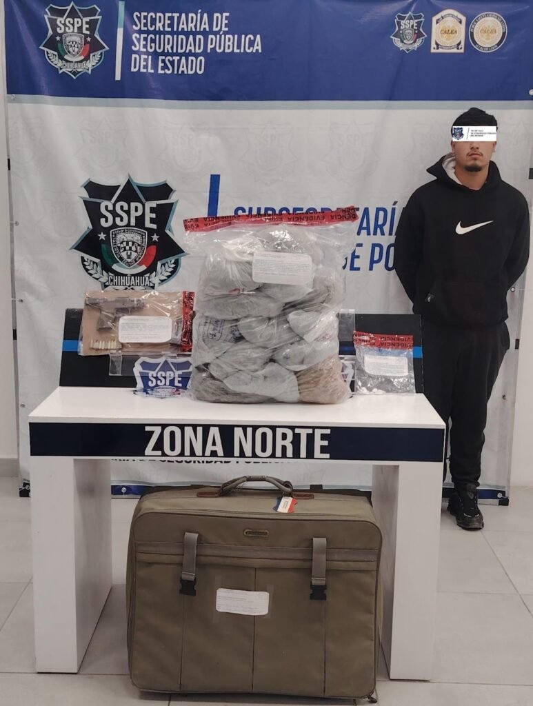 La Policía de Despliegue de la Secretaría de Seguridad Pública del Estado (SSPE), en colaboración con el Ejército Mexicano y la Guardia Nacional, llevó a cabo la detención de un sujeto de 18 años de edad en Ciudad Juárez, quien fue sorprendido en posesión de un arma de fuego y presunta droga.
