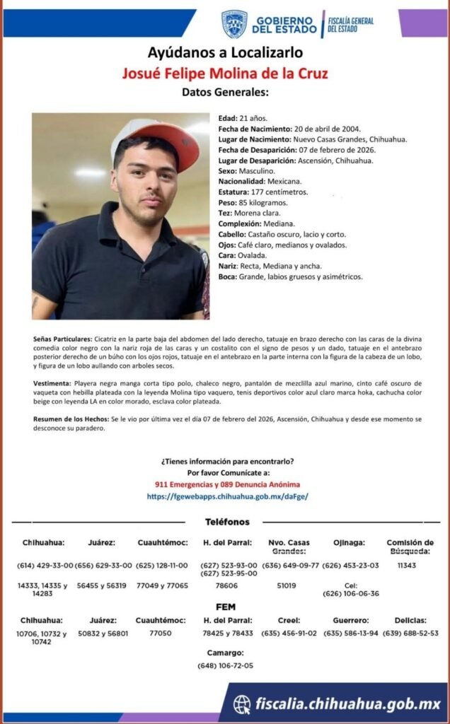 Se exhorta a la ciudadanía a proporcionar a las autoridades, cualquier información que sea útil para la localización de personas víctimas de desaparición forzada, ausentes o extraviadas, comunicándose al 911 de Emergencias, al 089 de Denuncia Anónima o a las oficinas de la Fiscalía de Distrito Zona Noroeste, teléfono 636-661-4312, extensión 51019.
