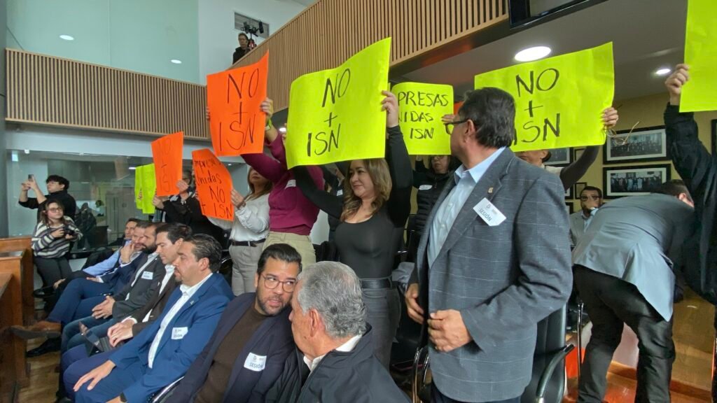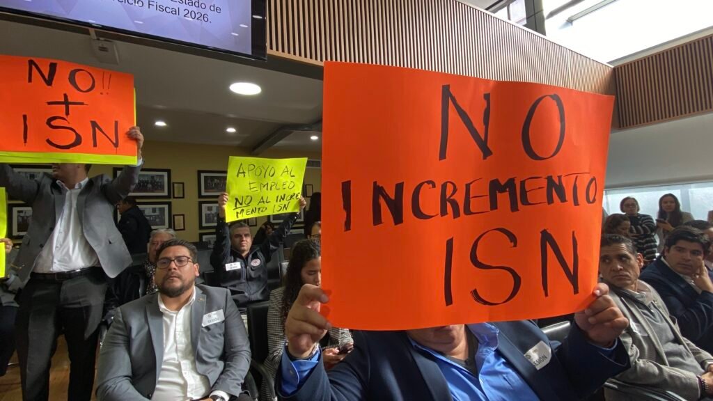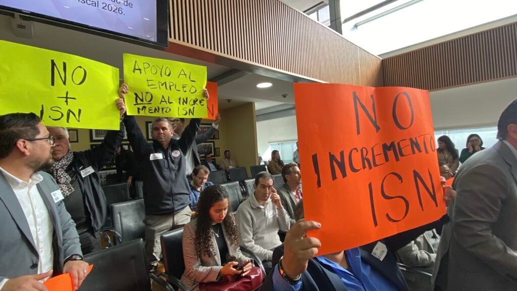 Con pancartas empresarios alzan la voz en congreso del Estado con el fin de evitar el incremento al Impuesto Sobre Nómina.