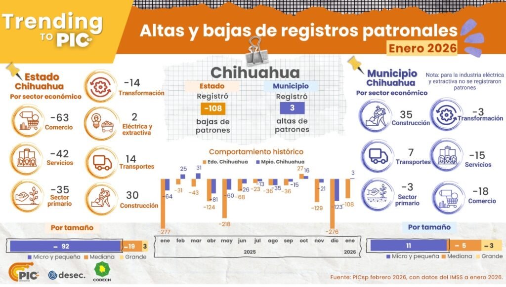 Mientras la mayoría de los municipios reportaron bajas, únicamente Chihuahua, Madera y Saucillo registraron 3 altas de patrones y Ojinaga 1 alta, en tanto Juárez fue el municipio con la mayor pérdida, al registrar 28 bajas en registros patronales en enero 2026.