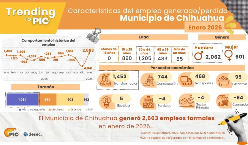 El Consejo de Desarrollo Económico Regional de Chihuahua (CODER) a través de su Plataforma de Inteligencia Competitiva del Sector Privado (PICPS) dio a conocer que la ciudad de Chihuahua concluyó el mes de enero con la generación de 2 mil 663 plazas laborales.