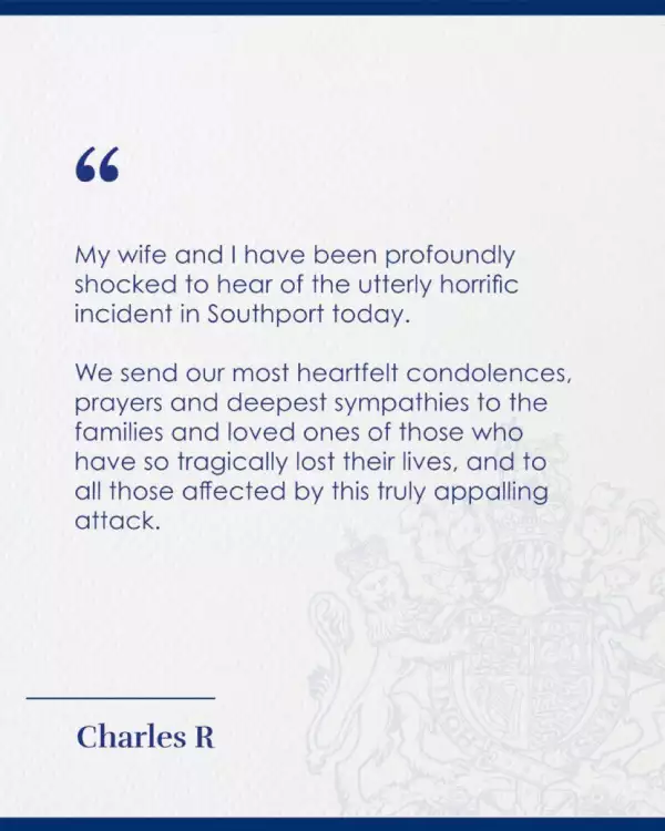 «Mi esposa y yo estamos profundamente impactados al escuchar del horrible incidente (ocurrido) hoy en Southport. Enviamos nuestras más sentidas condolencias y más profunda simpatía a las familias y seres queridos de quienes han perdido la vida de forma tan trágica y a todos aquellos afectados por este atroz ataque», escribieron los monarcas.